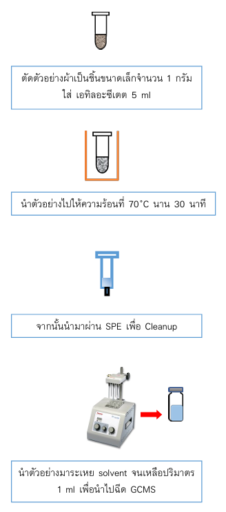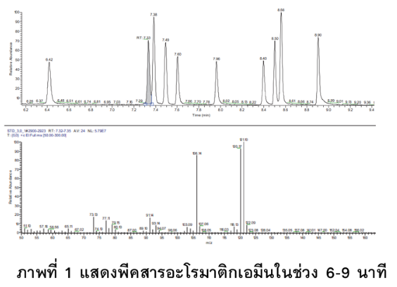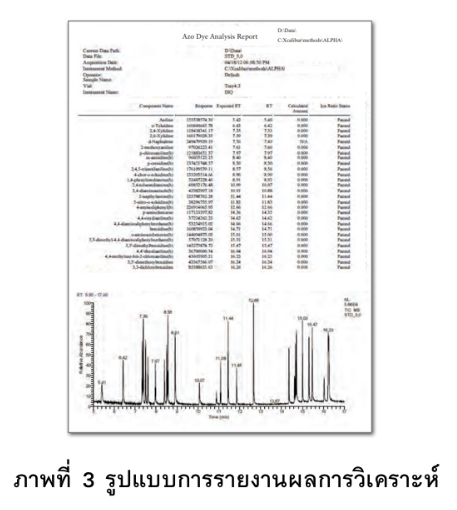 จากข้อกำหนดจากมาตรฐานยุโรป BS-EN 14362 และ มาตรฐานอุตสาหกรรม (มอก. 2346 – 2550) กำหนดให้มี ปริมาณอะโรมาติกเอมีน 24 ตัวในผลิตภัณฑ์รวมแล้วมีปริมาณ ไม่เกินกว่า 30 mg/kg ซึ่งวิธีการยืนยันและวิเคราะห์หาปริมาณของ สารประกอบอะโรมาติกเอมีนดังกล่าวสามารถใช้เทคนิค GC-MS โดยใช้โหมด Full scan เพื่อเปรียบเทียบลักษณะสเปคตรัมกับ ฐานข้อมูล NIST เพื่อเป็นกำรช่วยยืนยันโครงสร้างทางเคมีของ สารอะโรมำติกเอมีนและใช้น้ำหนักมวลของสารอะโรมาติกเอมีน แต่ละตัวเพื่อนำมาวิเคราะห์เชิงปริมาณในโหมด SIM ก็จะทำให้การวิเคราะห์ถูกต้องและมีความน่าเชื่อถือมากขึ้น